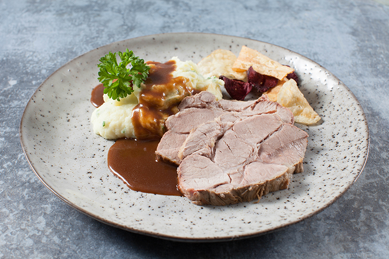 Tyttebær, asier, waldorfsalat, pærer med tyttebærcreme, brunede- & hvidekartofler, chips & sauce